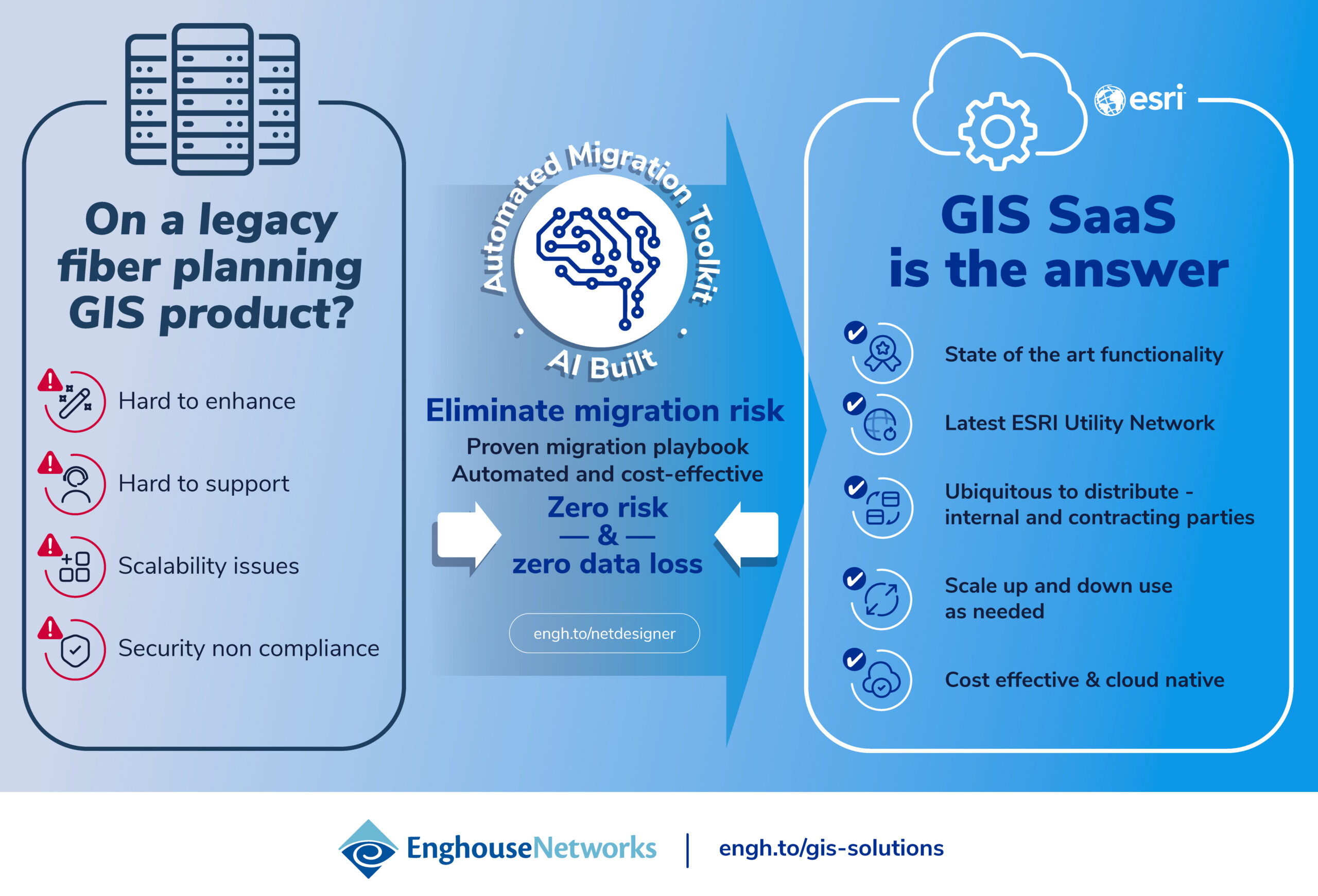 Legacy GIS tools can slow down fiber planning, limit scalability, and create support and compliance challenges. GIS SaaS provides a modern, cloud-based approach-built on the latest Esri Utility Network – without the migration risk.