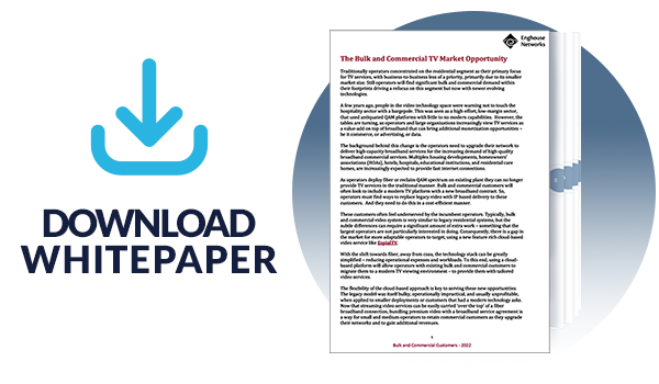 Serving TV to bulk and commercial customers can be a challenge. The challenge is that, while the TV offer is similar to that offered to residential consumers, it is sufficiently different that standard offers cannot support it or the effort/cost to support the nuances required by these customers can be high. Bulk and commercial customers can represent a significant opportunity for operators for services from broadband to hosted contact centers to connectivity and TV can be a requirement to be successful in this market. Technology has now evolved to a point where operators can create TV offers for this customers that meet the requirements and do so with cost points that make sense.