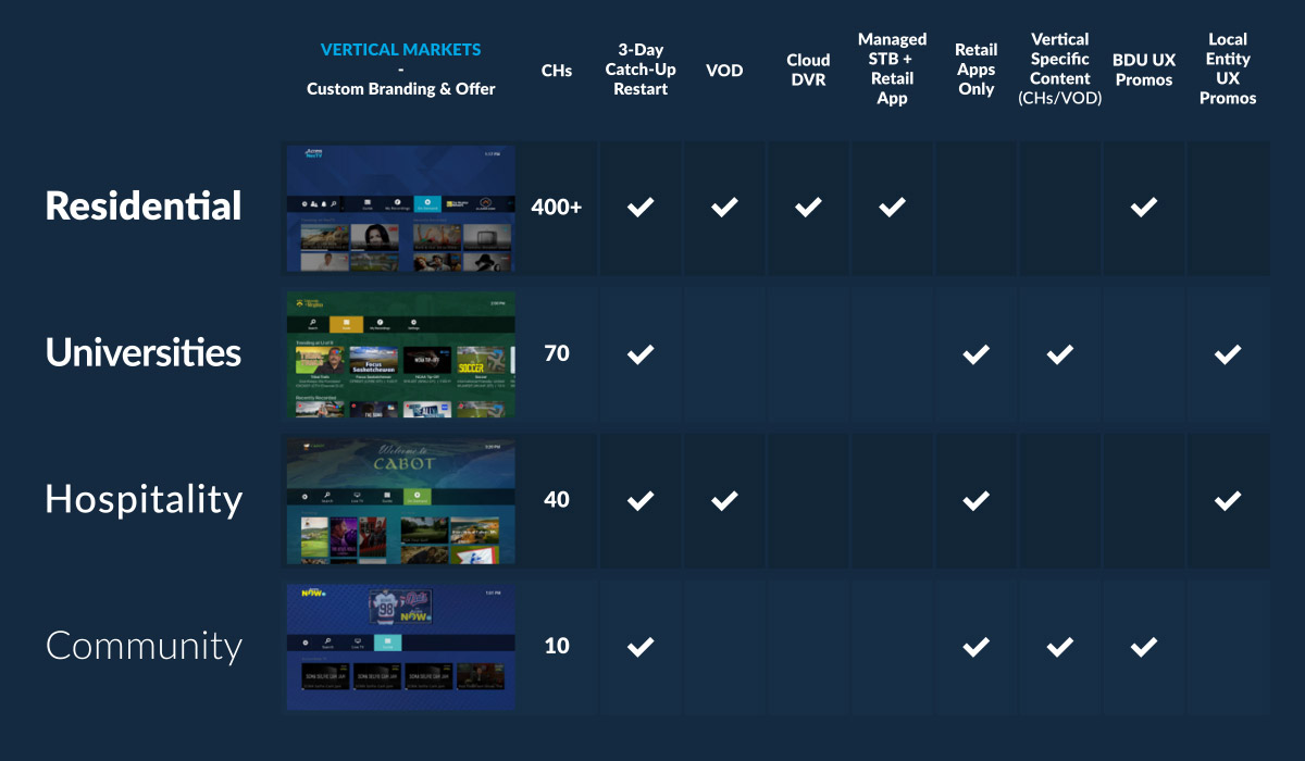 - Local channels – Ability to handle local channels. This could be a hotel offering details on their services, a condo unit lobby camera or a university media channel.