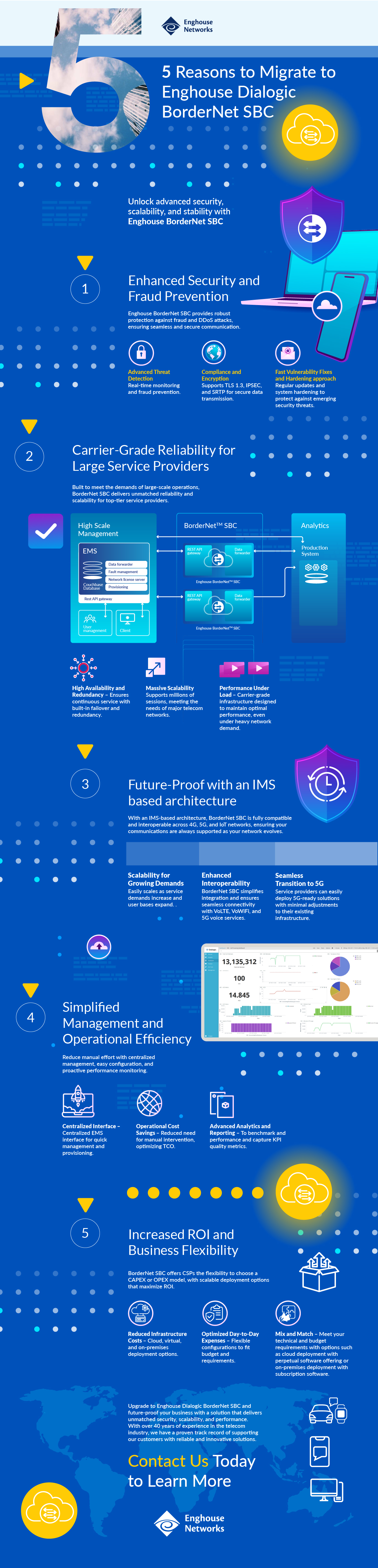 Migrating to Enghouse Dialogic BorderNet SBC offers advanced security, carrier-grade reliability, and future-proof compatibility for 4G, 5G, and IoT networks. Simplified management and deployment flexibility ensure operational efficiency and maximised ROI. Designed for scalable, secure, and efficient operations, it’s a robust solution to meet evolving telecom needs while protecting critical infrastructure.